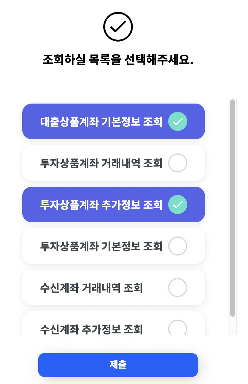 <input type="checkbox" id="option2" name="scope" value="2"><label for="option2">투자상품계좌 거래내역 조회</label>