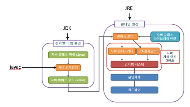JDK는 개발에 필요한 모든 도구를 포함하고 있지만, JRE는 자바 애플리케이션을 실행하는 데 필요한 도구만 포함하고 있다는 것이다.
