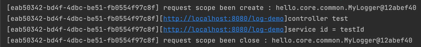 이 빈이 생성되는 시점에 자동으로 @PostConstruct 초기화 메서드를 사용해서 uuid를 생성해서 저장해둔다. 이 빈은 HTTP 요청 당 하나씩 생성되므로, uuid를 저장해두면 다른 HTTP 요청과 구분할 수 있다.
