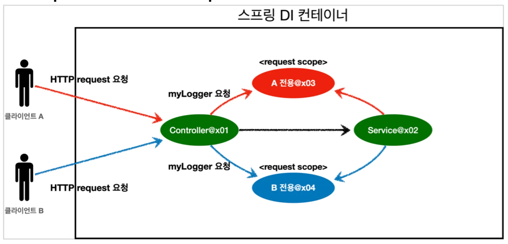 이렇게 하면 MyLogger의 가짜 프록시 클래스를 만들어두고 HTTP request와 상관 없이 가짜 프록시 클래스를 다른 빈에 미리 주입해 둘 수 있다.