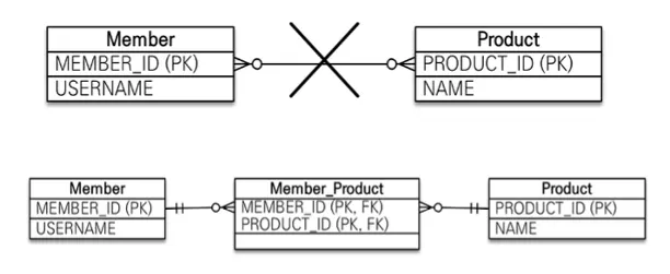 RDB는 정규화된 테이블 2개로 다대다 관계를 표현할 수 없음