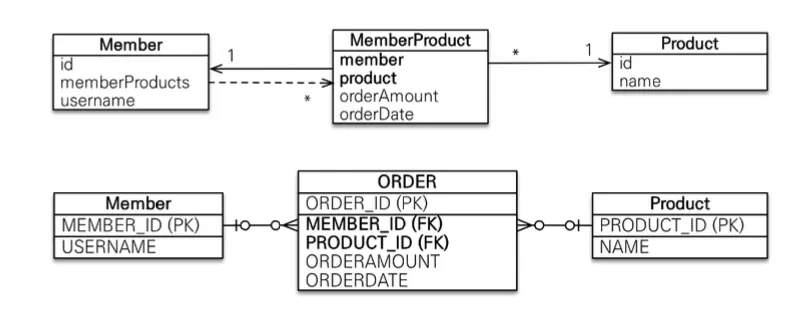 객체는 컬렉션을 이용해 객체 2개로 다대다 관계 가능