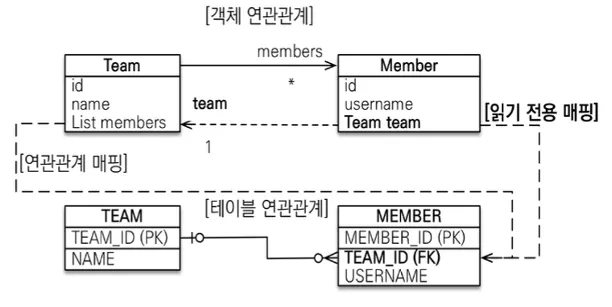 주인의 반대편 : 외래 키에 영향을 주지 않음, 단순 조회만 가능