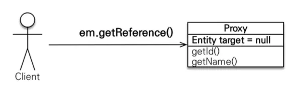 em.getReference(): 데이터베이스 조회를 미루는 가짜(프록시) 엔티티 객체 조회