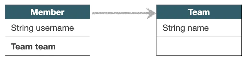 위와 같은 객체가 있다고 가정하자, Member라는 엔티티는 team이라는 엔티티와 연관관계 매핑이 되어 있다.