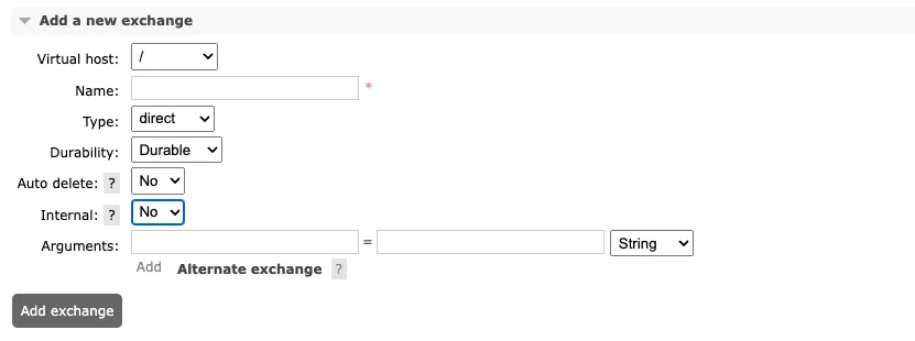 Durability : 브로커를 다시 실행해도 exchange를 유지할지에 관한 옵션