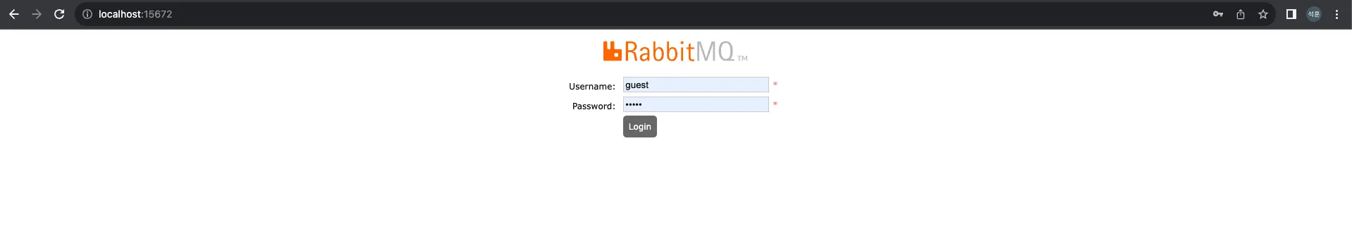 위 명령어로 Rabbitmq를 시작하고 http://localhost:15672 를 통해 RabbitMQ 콘솔에 접근 가능