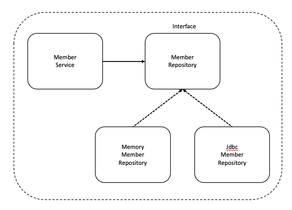 실행 시점에 클라이언트 변경 없이 MemoryMemberRepository를 이용할 지, JdbcMemberRepository를 이용할 지 실행 시점에 결정할 수 있다.